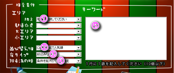 指定したキーワードを、ホテルデータの「ホテル名」「ホテル紹介文」から検索します。
