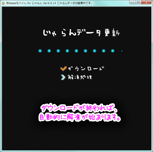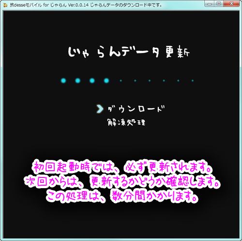 ウイルス対策ソフトなどの警告が出た場合は、実行許可を与えてください。 - 初回起動時は、じゃらんデータのダウンロードが自動的に始まります。