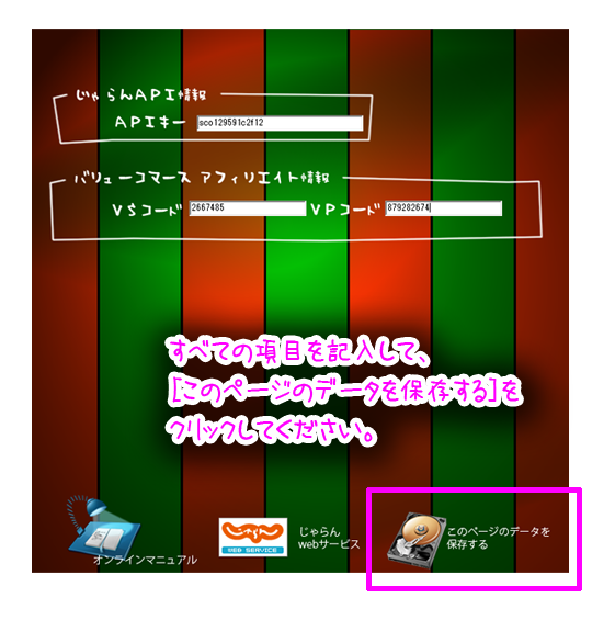 このメッセージは初回登録時のみです。 - 全ての項目を記入して、[このページのデータを保存する]をクリックします。