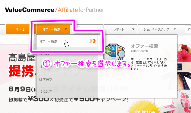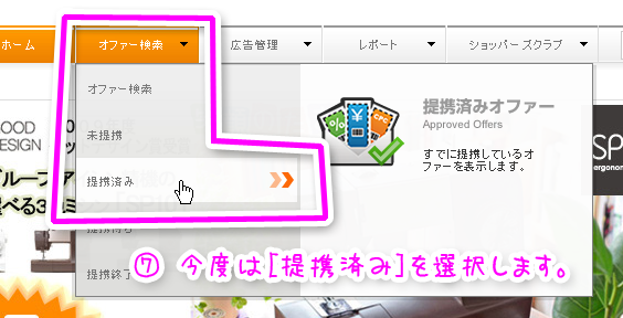 - 今度は[オファー検索]-[提携済み]を選択します。