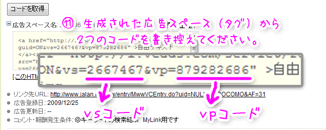 「コードを取得]をクリックしてください。 - 生成された広告スペース(アフィリエイトタグ)から、