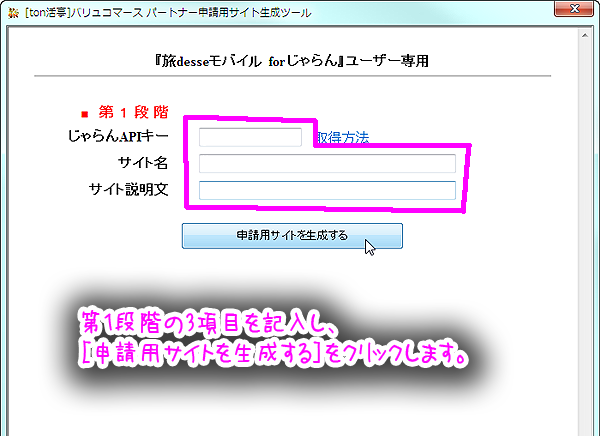 ダブルクリックしてツールを起動させて下さい。 - 第1段階の3つの項目を記入し、[申請用サイトを生成する]をクリックして下さい。